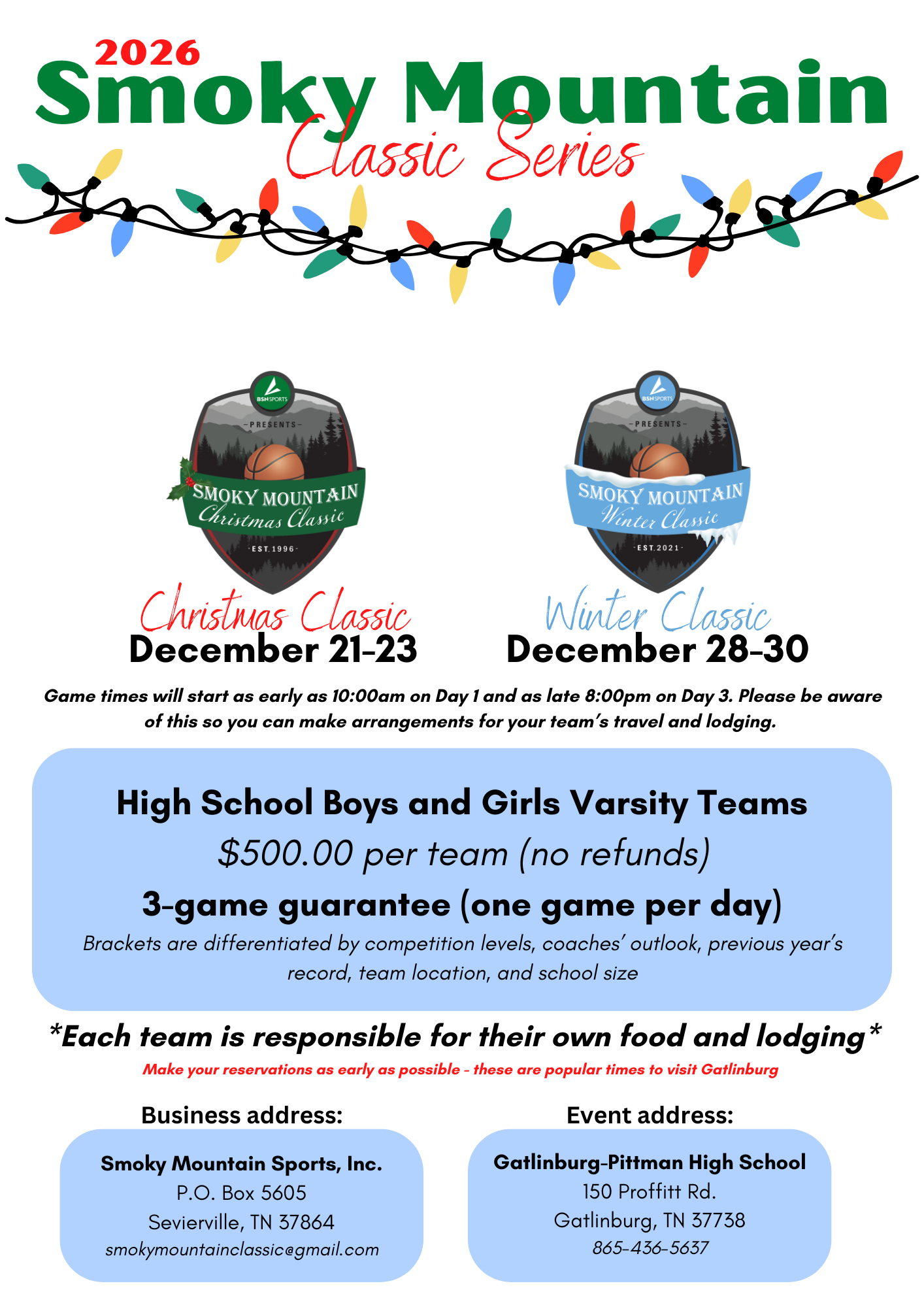 Welcome to the Smoky Mountain Sports, Inc. website. Smoky Mountain Sports, Inc. is the home of the Smoky Mountain Christmas Classic and the Smoky Mountain Winter Classic.